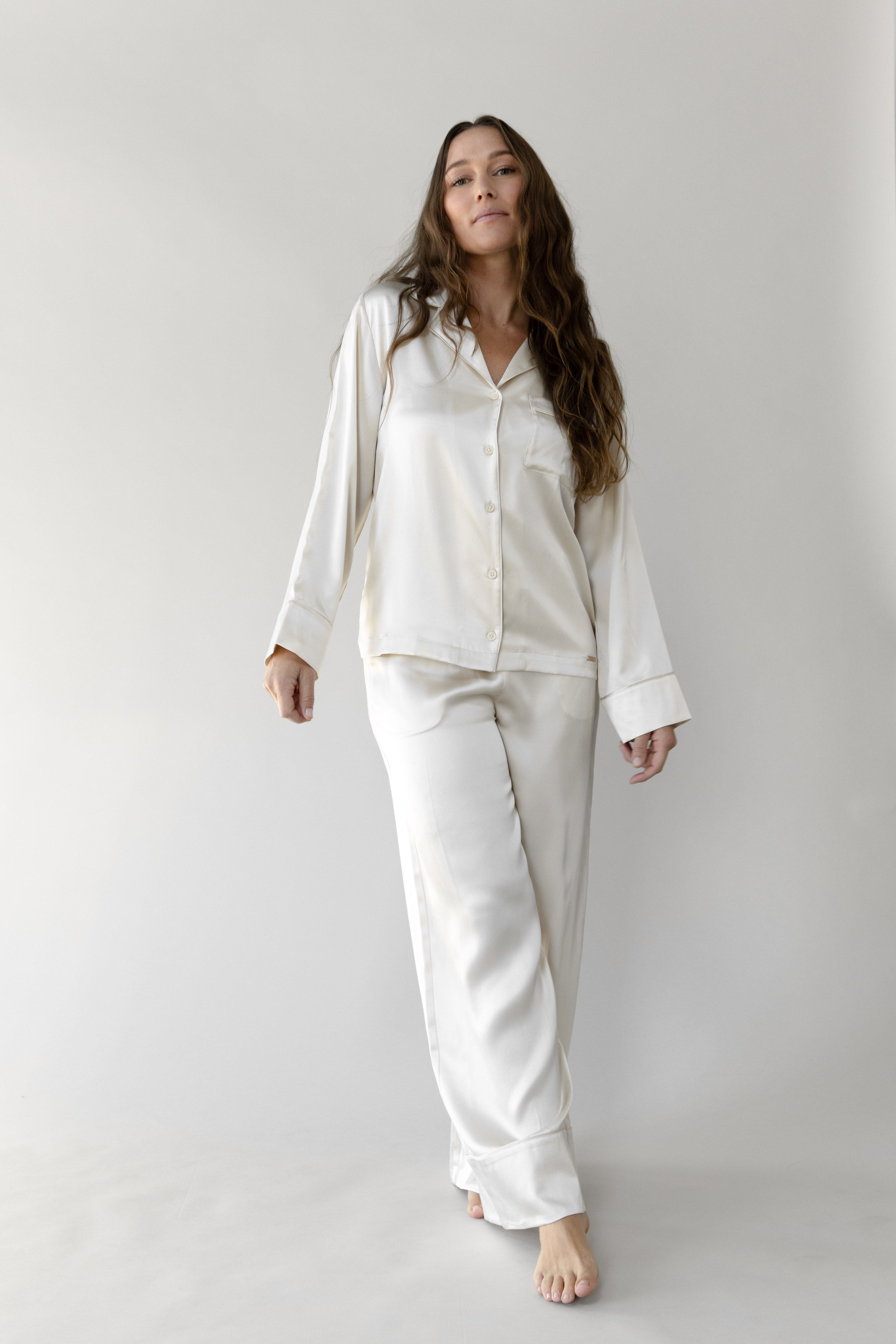 Feel the luxury with our Silk Long Sleeve Pajama Top as it glides over your skin effortlessly. Treated with aloe vera and made from 100% mulberry silk, this top is lightweight, soothing, and loose-fitting. Featuring a chest pocket, elegant mulberry silk flat piping, inner French seams, logo engraved shell buttons, and an eco-friendly plated logo charm. Pair with our women's silk pajama shorts or women's silk pajama pants for the ultimate silk sleep set.